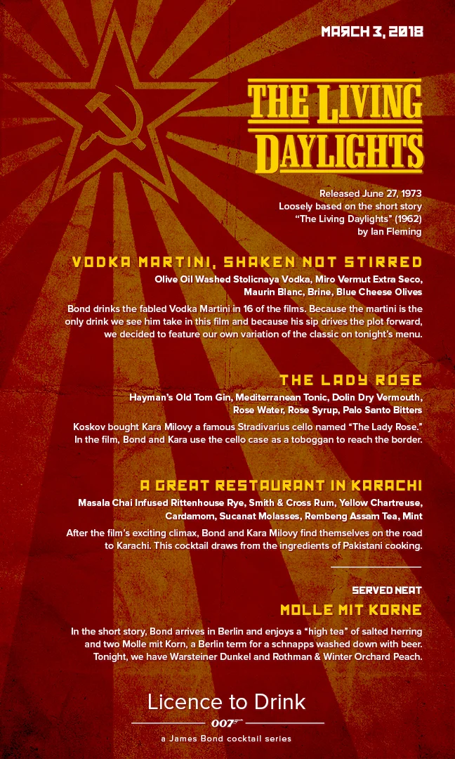 Our Licence to Drink parties are each inspired by a particular Bond movie. We draw influences from the novel, the film, our favorite scenes or characters, featured locales, and of course, the drinks Bond consumes along the way.